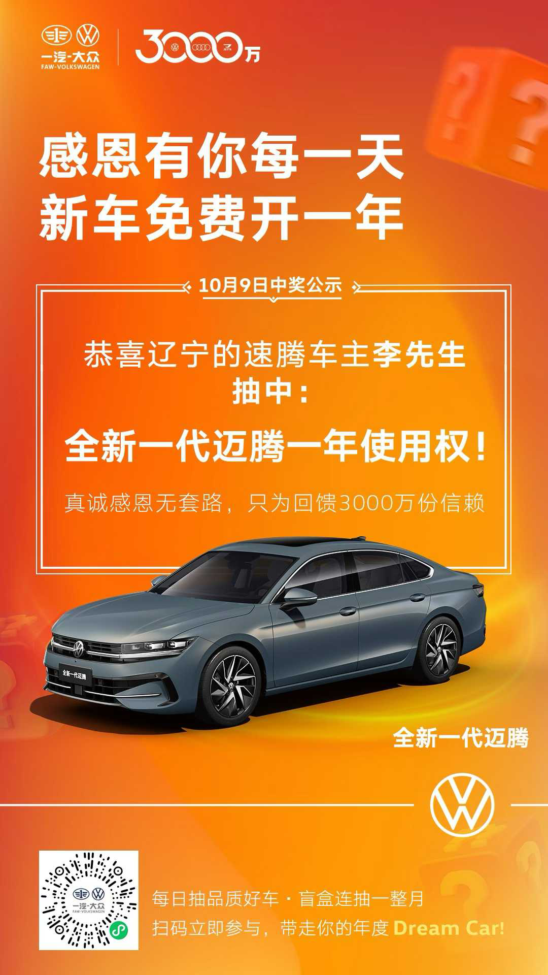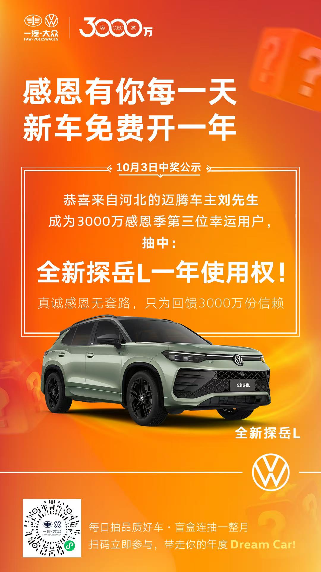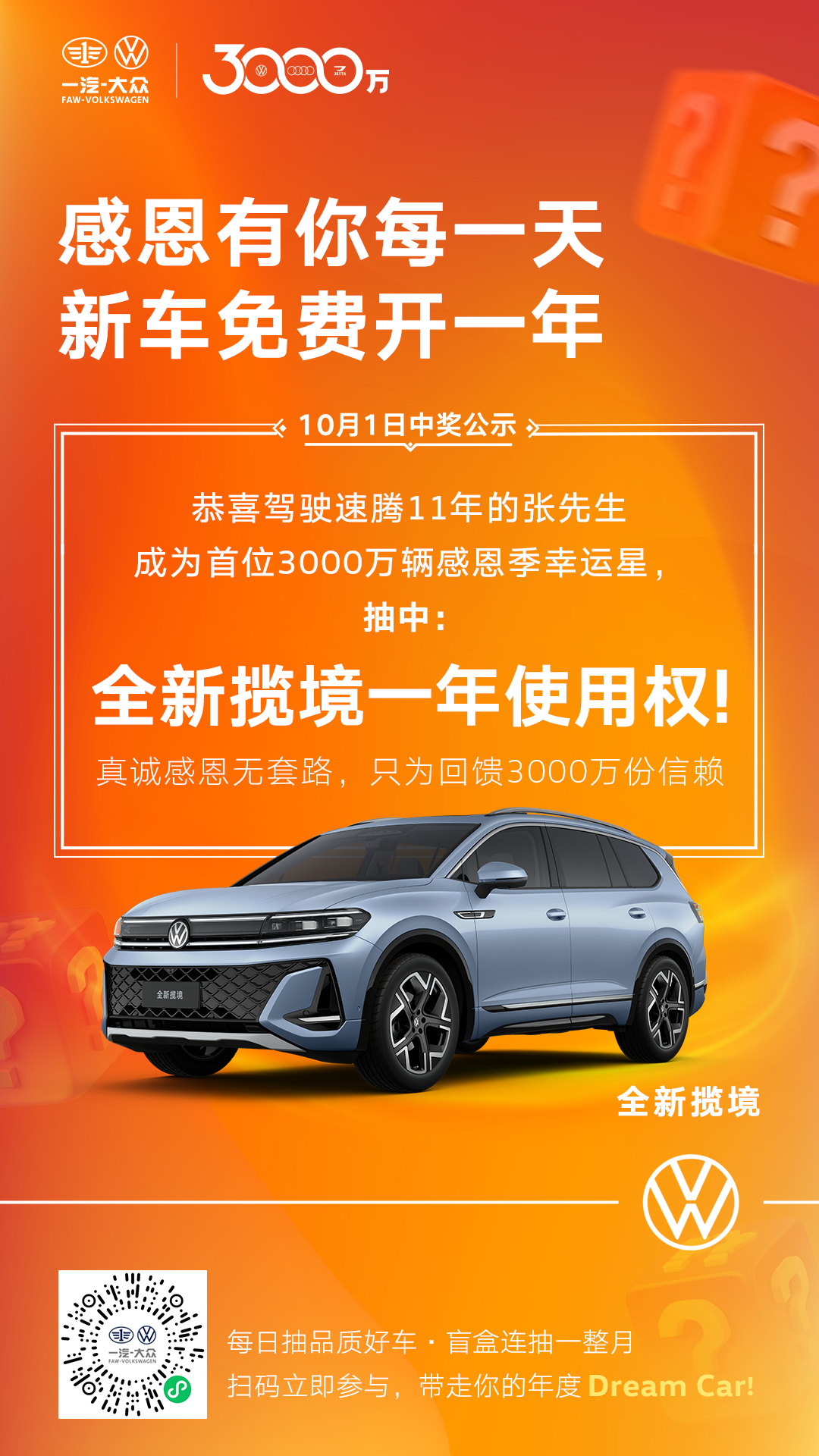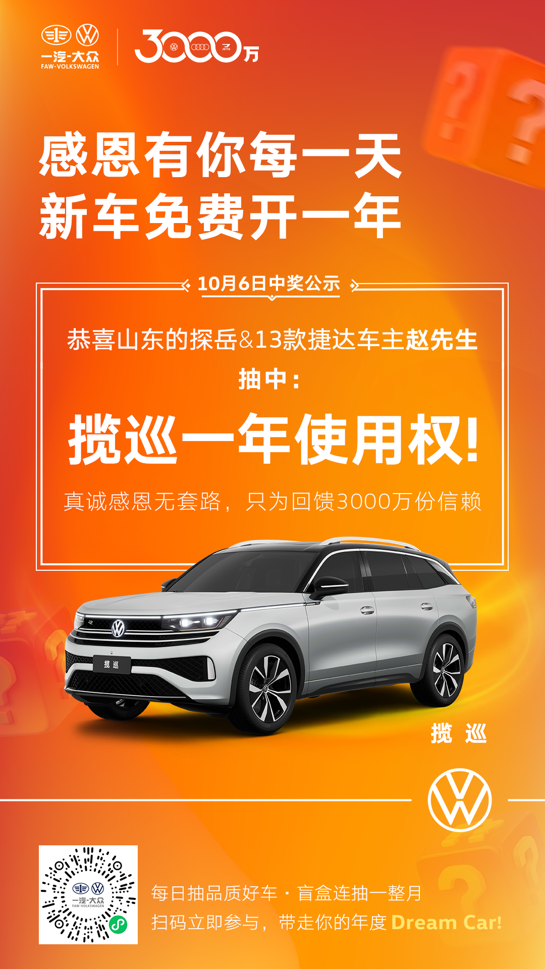 規模之上是責任,這份責任既是對品質的堅守,也是對客戶的承諾,一汽-大眾將“可靠”從產品品質延伸至服務領域。為答謝3000萬客戶的支持與信賴,一汽-大眾特別推出“3000萬用戶感恩禮”——車主報名抽取新車“免費開一年”使用權,大眾品牌吸引超過64000位車主報名參與。十一長假期間共誕生八位“幸運星”,分別獲得全新攬境、攬巡、全新探岳L、全新一代速騰L及全新一代邁騰車型的一年使用權。目前該活動仍在火熱進行中,10月27日前仍可報名參與。