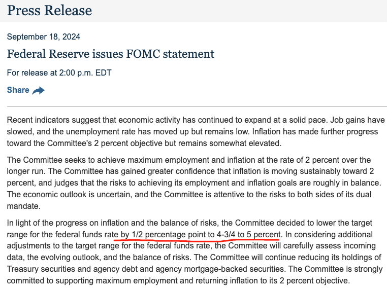 北京時間9月19日凌晨,美聯儲宣布將聯邦基金利率目標區間下調50個基點至4.75%-5.00%。