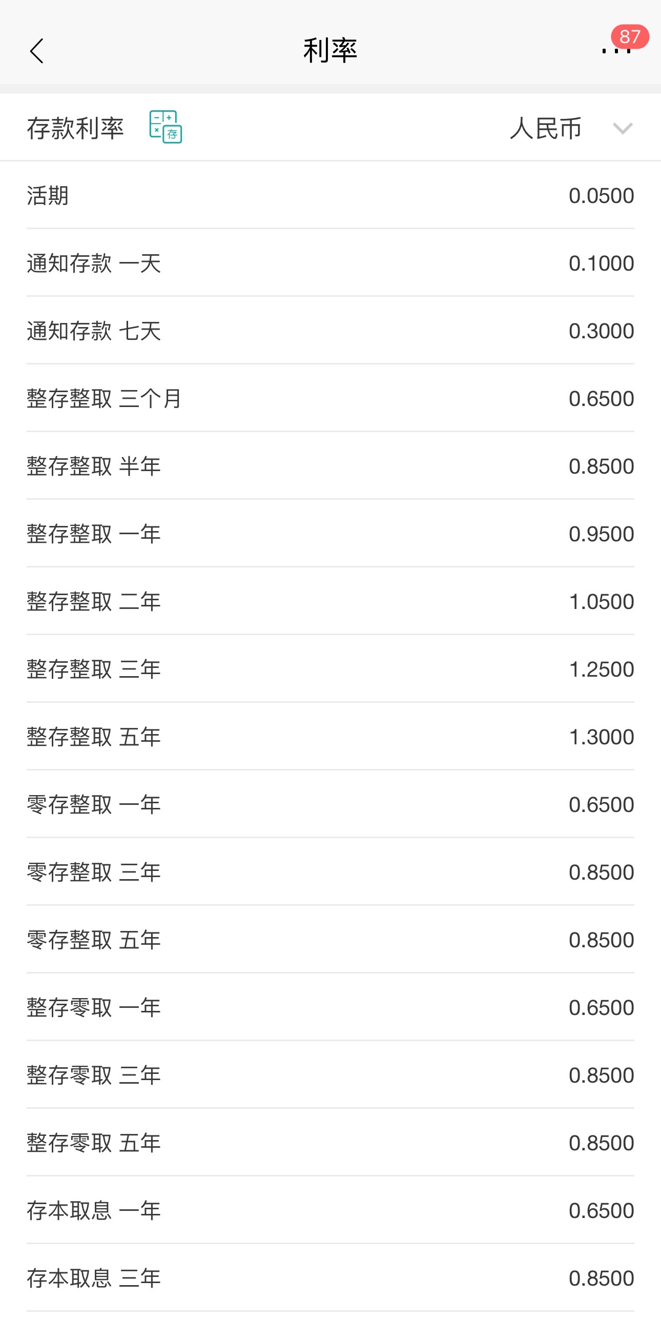 全國性股份制銀行方面,招商銀行5月20日也公布了最新存款掛牌利率表,對人民幣存款利率進行下調。其中,活期利率下調5個基點為0.05%;3個月、6個月、1年期、2年期、3年期、5年期定期存款利率(整存整?。?.65%、0.85%、0.95%、1.05%、1.25%、1.3%。