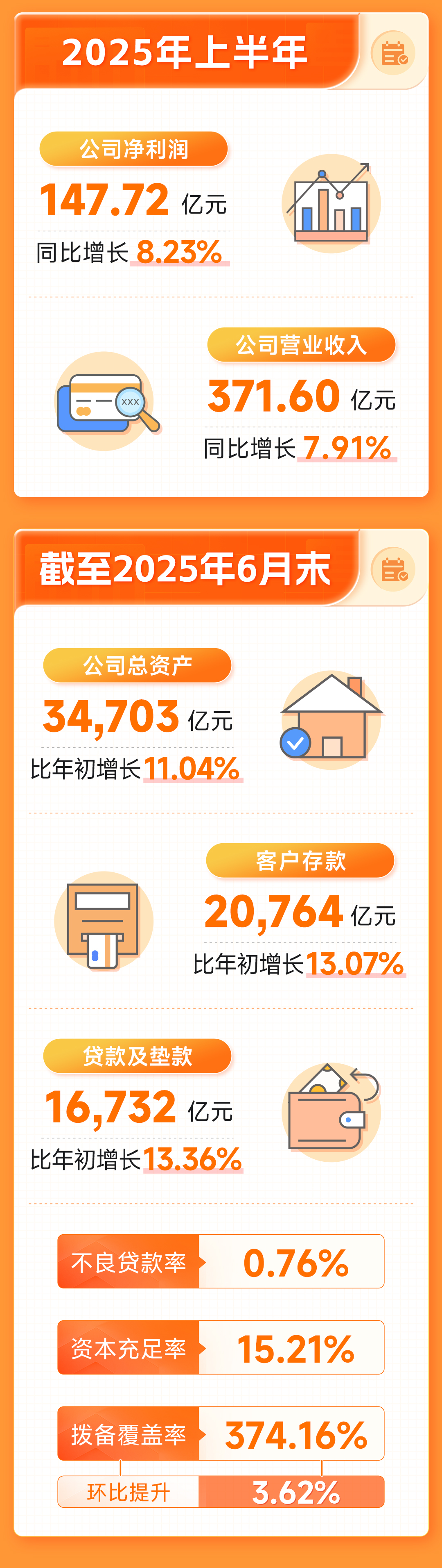 2025年上半年,寧波銀行營業收入371.60億元,較上年同期增長7.91%;實現歸屬于母公司股東的凈利潤147.72億元,較上年同期增長8.23%;年化加權平均凈資產收益率13.80%。