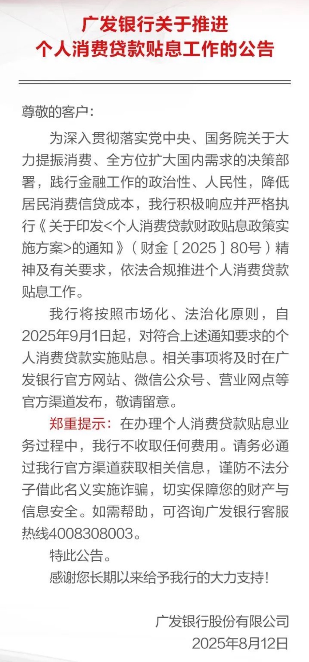 廣發(fā)銀行公告提到,將按照市場化、法治化原則,自2025年9月1日起,對符合通知要求的個人消費貸款實施貼息。