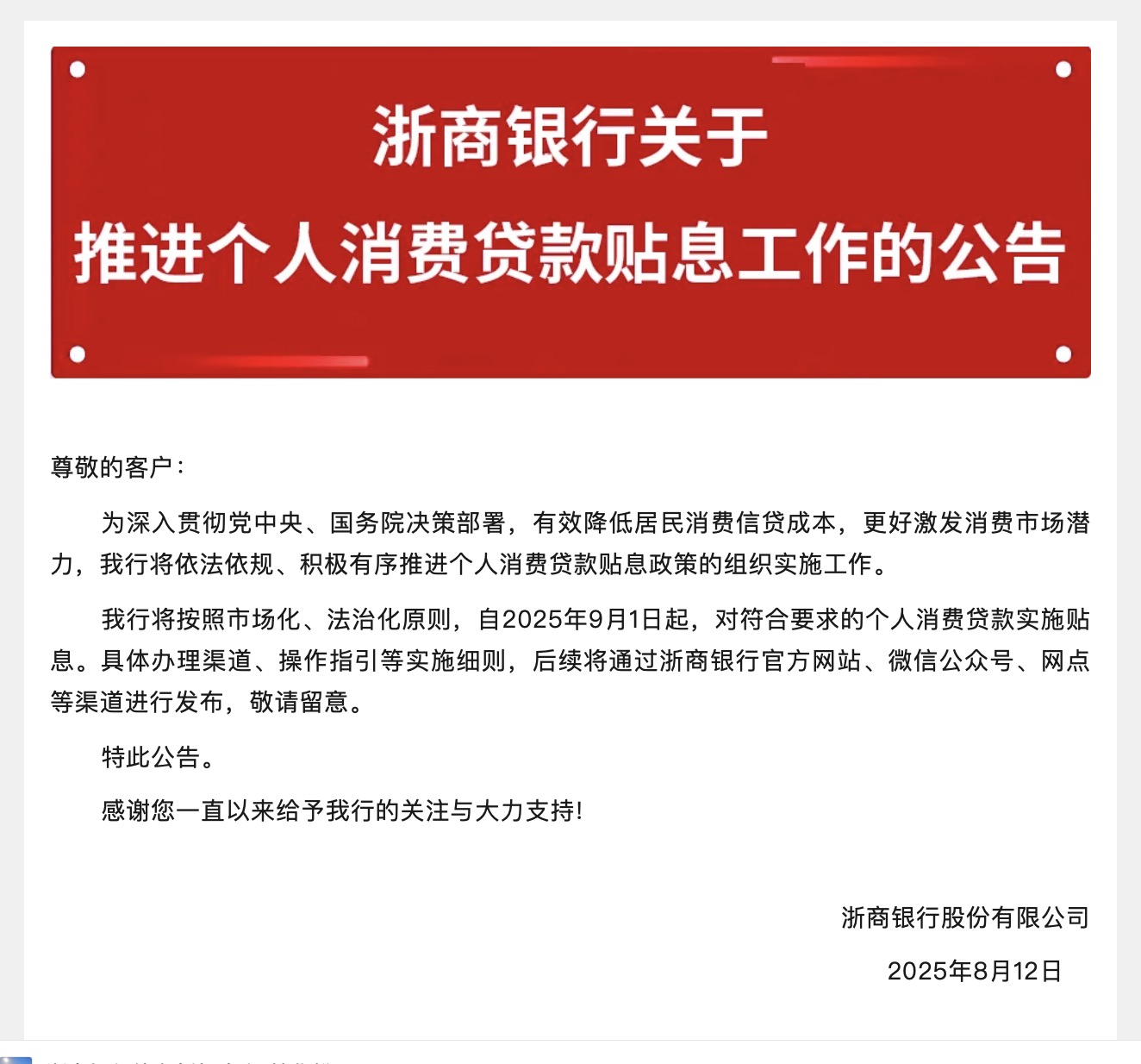 浙商銀行公告顯示,將依法依規(guī)、積極有序推進個人消費貸款貼息政策的組織實施工作。該行將按照市場化、法治化原則,自2025年9月1日起,對符合要求的個人消費貸款實施貼息。