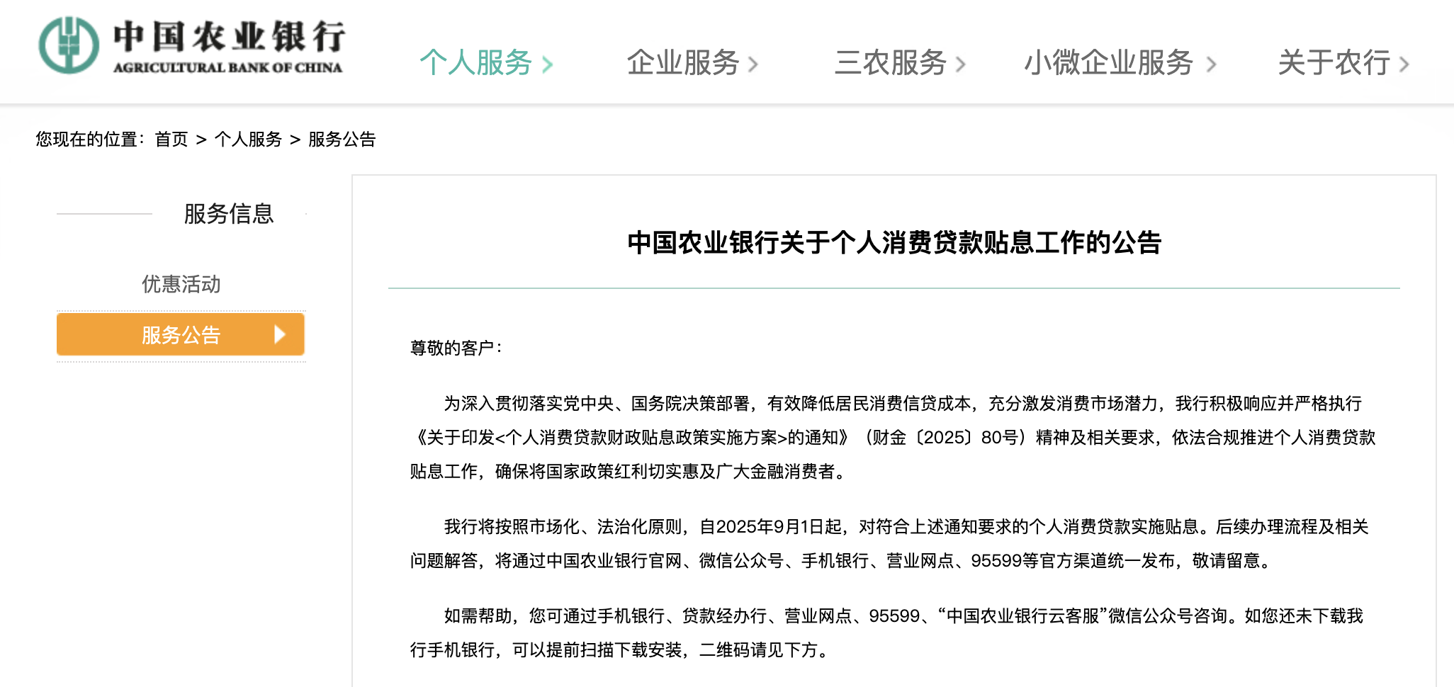 具體來看,農(nóng)業(yè)銀行公告提到,將按照市場化、法治化原則,自2025年9月1日起,對符合上述通知要求的個人消費貸款實施貼息。