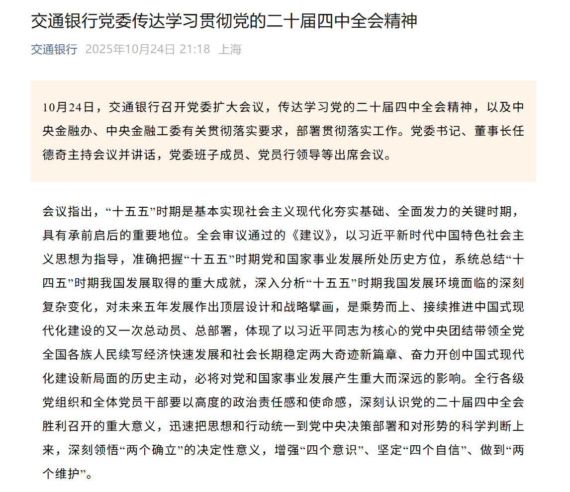 交通銀行會議要求,要全面對標(biāo)全會部署要求,以國家“十五五”規(guī)劃為指引,高質(zhì)量編制好交行“十五五”規(guī)劃。全面總結(jié)“十四五”時期改革發(fā)展經(jīng)驗(yàn)成果,用好“六個堅持”方法論,突出目標(biāo)導(dǎo)向、問題導(dǎo)向,加緊謀劃重大戰(zhàn)略命題。要堅持一張藍(lán)圖繪到底,做好“十四五”“十五五”有序銜接,進(jìn)一步校準(zhǔn)戰(zhàn)略方向、突出戰(zhàn)略重點(diǎn)、打造戰(zhàn)略特色。
