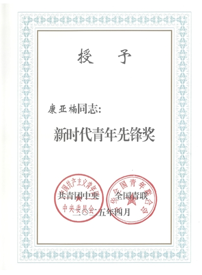 新時代青年先鋒獎是共青團中央、全國青聯授予中國優秀青年的重要榮譽,旨在表彰我國優秀青年在推進中國式現代化中的貢獻,集中展示新時代中國青年的精神品格和價值追求,激勵引導全國廣大青年積極投身強國建設、民族復興偉業,勇做中國式現代化建設的先鋒力量。