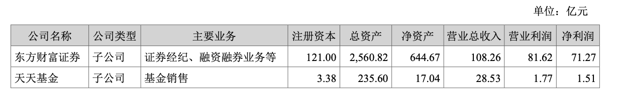 值得關注的是,東方財富旗下兩大“王牌”子公司東方財富證券股份有限公司(以下簡稱“東方財富證券”)、上海天天基金銷售有限公司(以下簡稱“天天基金”)為其貢獻了不俗的業績。其中,東方財富證券為東方財富貢獻了108.26億元的營業收入以及71.27億元的凈利潤;天天基金為東方財富貢獻了28.53億元的營業收入以及1.51億元的凈利潤。