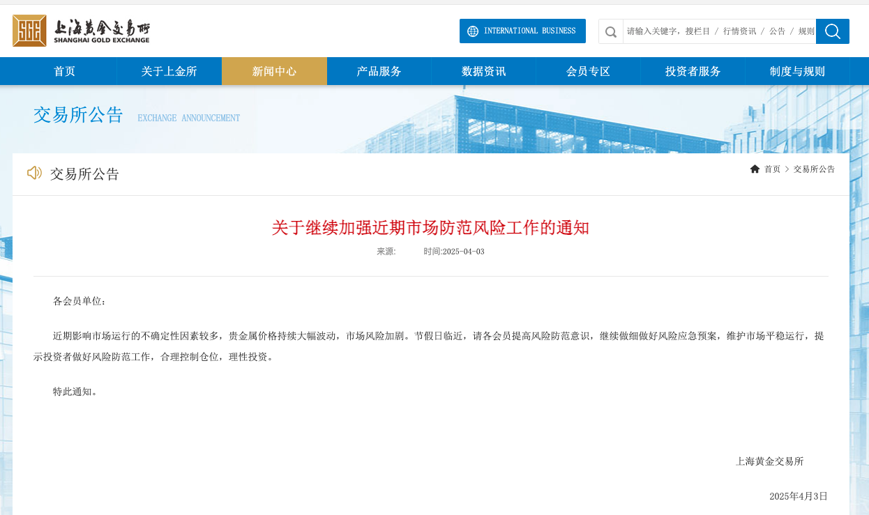 同日,上海黃金交易所(簡稱“上金所”)發布《關于繼續加強近期市場防范風險工作的通知》(以下簡稱《通知》)。《通知》稱,近期影響市場運行的不確定性因素較多,貴金屬價格持續大幅波動,市場風險加劇。