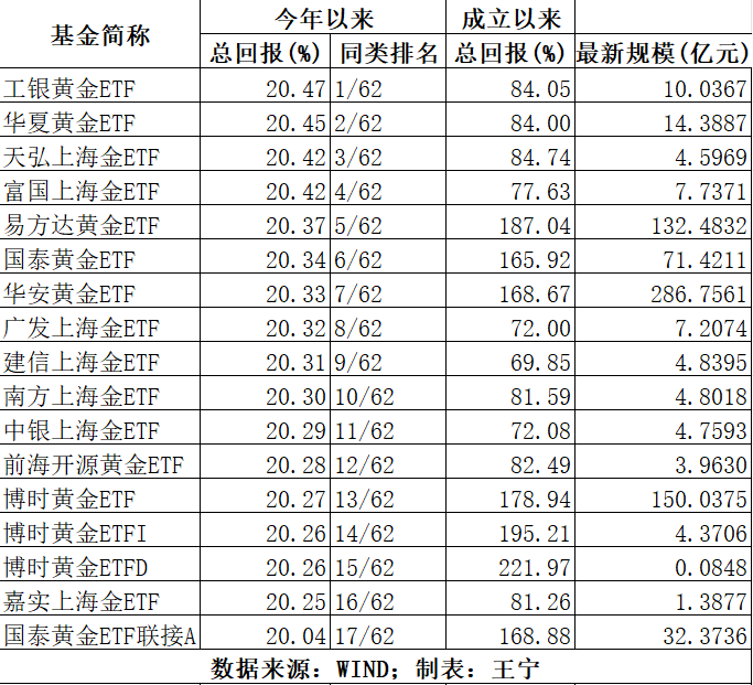 數據顯示,62只商品型基金中年內業績表現較好的均為黃金主題產品,例如華夏黃金ETF、天弘上海金ETF、國泰黃金ETF、南方上海金ETF和嘉實上海金ETF等17只產品,收益率均超過20%;同時,另有35只黃金聯接基金年內收益也都保持在18%—20%之間。此外,多只豆粕和白銀等主題基金也都實現了正收益。