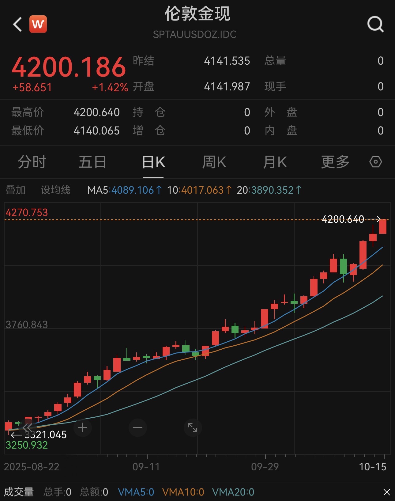 10月15日,國(guó)際現(xiàn)貨黃金價(jià)格持續(xù)走強(qiáng)。Wind數(shù)據(jù)顯示,倫敦金現(xiàn)貨價(jià)格歷史首次突破4200美元/盎司關(guān)口,日內(nèi)漲超1.4%。