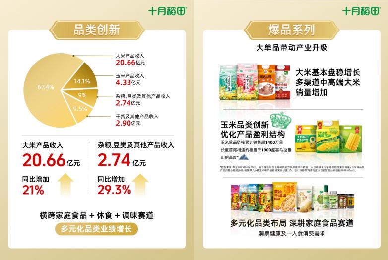 報告期內,十月稻田核心品類穩健增長,多元品類布局成效顯著。大米產品作為核心業務,營收達到20.66億元,同比增長21.0%;玉米品類營收4.33億元;雜糧、豆類及其他產品收入同比增加29.3%至2.74億元。