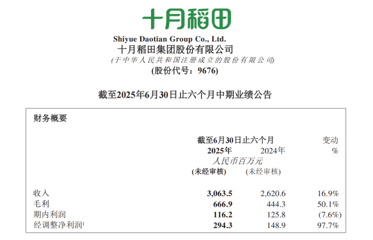 在健康飲食理念不斷深化的背景下,食品市場迎來了新一輪發展機遇。8月28日,家庭食品創新企業十月稻田集團股份有限公司(以下簡稱:十月稻田)公布了2025年中期業績報告,多項核心指標表現亮眼。數據顯示,報告期內集團實現營業收入30.64億元,同比增長16.9%;經調整凈利潤達2.94億元,同比大幅增長97.7%;凈利潤率也由去年同期的5.7%提升至9.6%,盈利能力顯著提升。