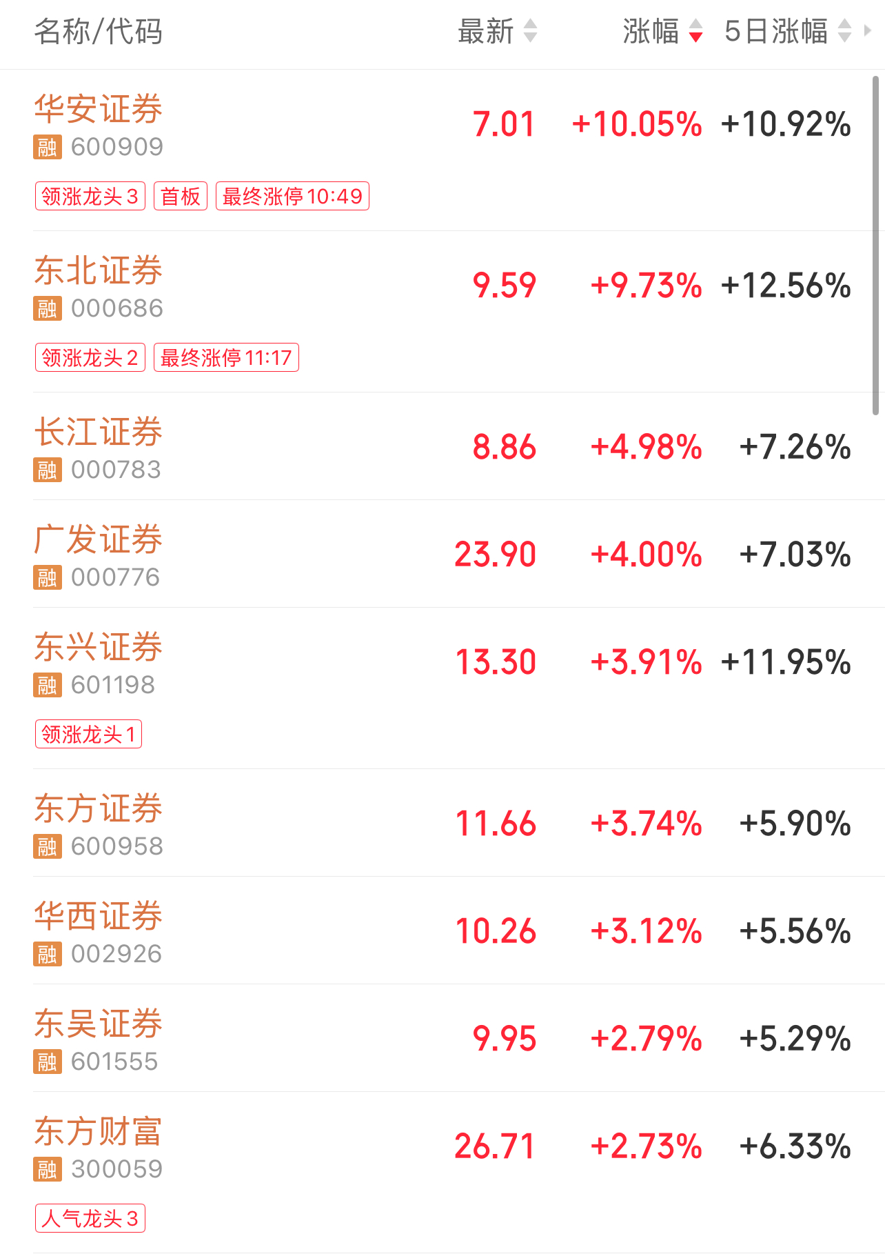 截至10月29日午間收盤,市場交投活躍,上證指數(shù)小幅上漲0.37%,報(bào)收于4002.83點(diǎn)。素有“牛市旗手”之稱的證券板塊整體表現(xiàn)亮眼,漲幅超過2%。其中,華安證券表現(xiàn)尤為突出,直接漲停封板;東北證券漲幅也超過9%;廣發(fā)證券、長江證券等個(gè)股漲幅均超過4%,證券板塊內(nèi)個(gè)股呈現(xiàn)出普漲態(tài)勢(shì),市場熱度明顯提升。