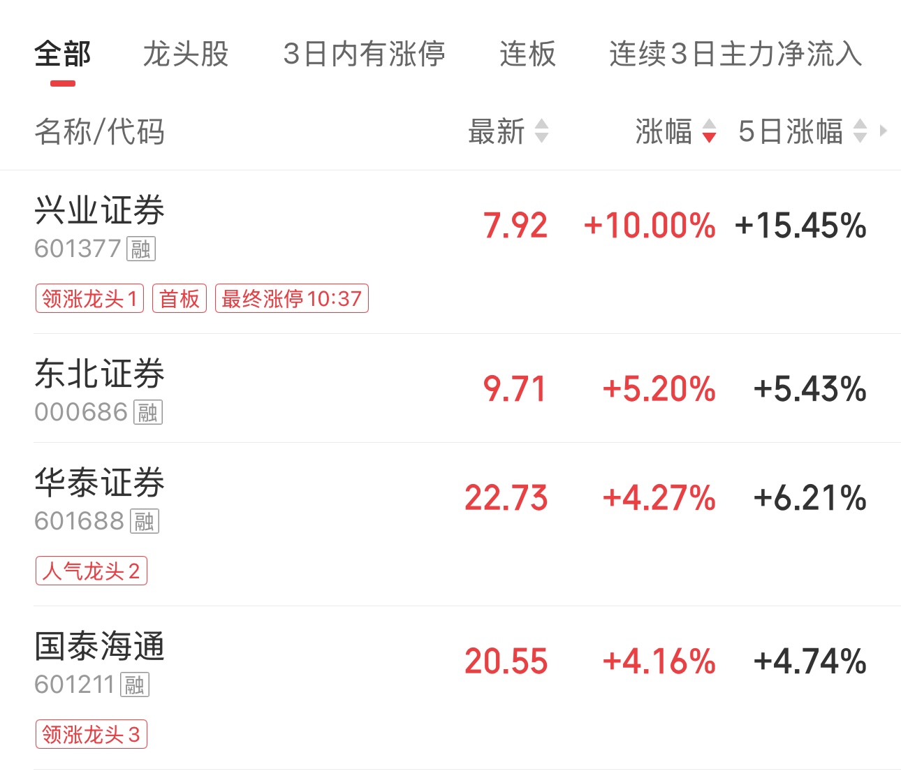 除因并購重組事項停牌的中金公司、信達證券、東興證券外,板塊內其余47只個股全線飄紅,興業證券漲停,半日成交額達47.62億元;東北證券漲超5%,華泰證券、國泰海通均漲超4%;行業龍頭中信證券半日成交額超65億元。