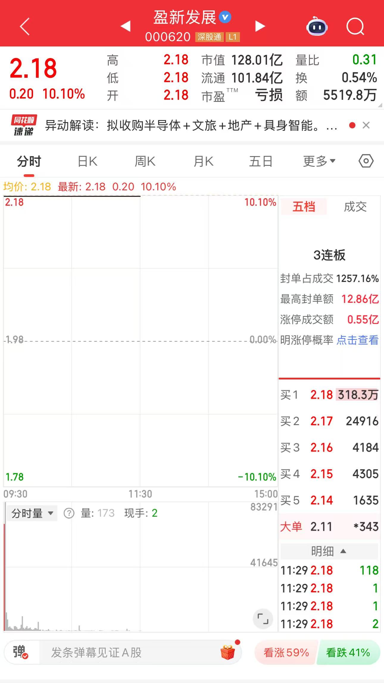 本報(bào)訊 (記者向炎濤)在接連斬獲兩個(gè)漲停板后,10月22日開盤,北京銅官盈新文化旅游發(fā)展股份有限公司(以下簡稱“盈新發(fā)展”,股票代碼:000620)股價(jià)又再次漲停。截至午間收盤,公司股價(jià)報(bào)收于2.18元/股。