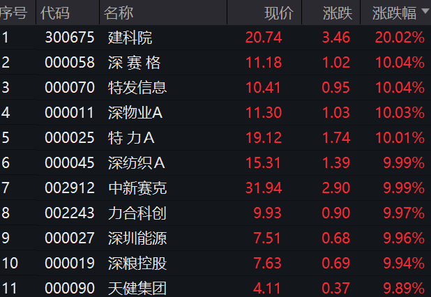 截至午間收盤,多只深圳本地股漲停,建科院以20.02%漲幅領漲,深賽格、特發信息、深物業A、特力A、深紡織A、中新賽克、力合科創、深圳能源、深糧控股、天健集團等股均“10cm”漲停。另外,麥捷科技、深圳燃氣等股均漲超4%。