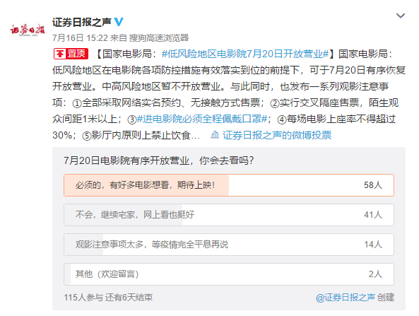 國家電影局:低風險地區在電影院各項防控措施有效落實到位的前提下,可于7月20日有序恢復開放營業。中高風險地區暫不開放營業。與此同時,也發布一系列觀影注意事項:①全部采取網絡實名預約、無接觸方式售票;②實行交叉隔座售票,陌生觀眾間距1米以上;③#進電影院必須全程佩戴口罩#;④每場電影上座率不得超過30%;⑤影廳內原則上禁止飲食… R證券日報之聲的微博投票